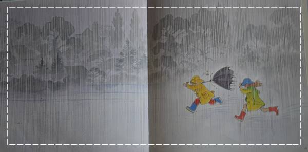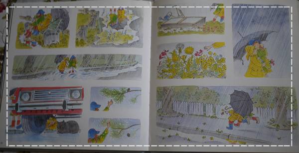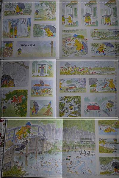 這繪本給我很大的深思,有被震撼到,且讓我想著,這是否就是東方&西方家庭教育上的大差異,從小我們就被教育著,下雨天媽媽說不可以出去,反觀西方世界的母親卻是鼓勵小孩去探索雨中即景,生活的體驗會誘導出生命的感受力。雖然近期,我們也開始趨向讓小孩在下雨的時候去玩玩踩水漥、聽聽雨聲不同的節奏,可是,身為新世代小孩的母親,我們依然不敢放手......。