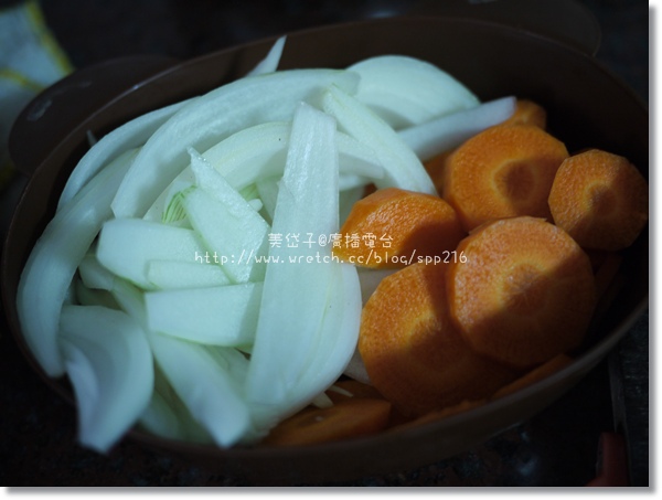 洋蔥切絲、胡蘿蔔切塊(片)、高麗菜就隨意切