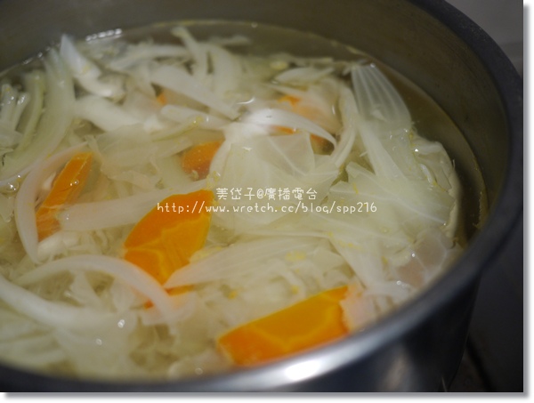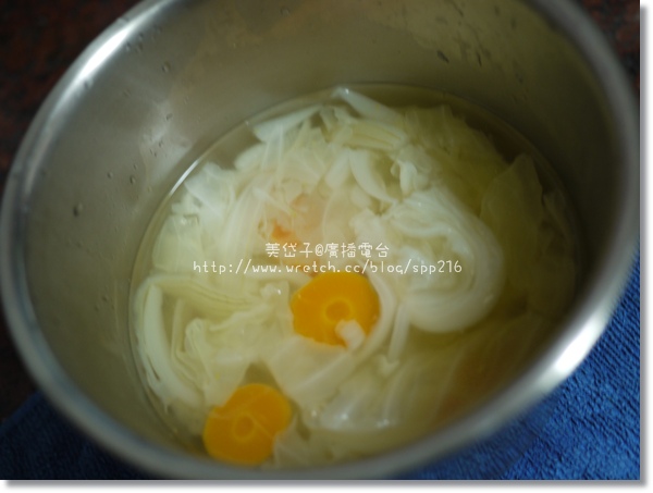 我用半顆高麗菜、一粒洋蔥、一條胡蘿蔔,加上約1000cc的開水,準備熬煮蔬菜湯嘍