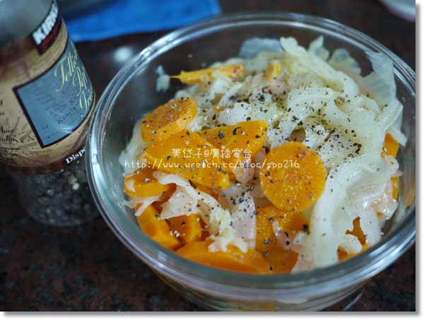 將蔬菜全撈了出來,放在保鮮盒中,灑上一些胡椒粉,這就成了我低GI飲食的一餐了