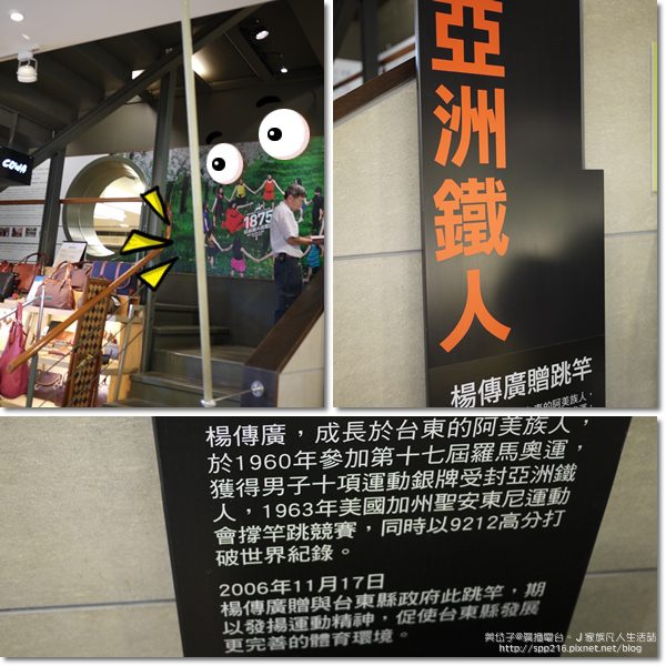 在賣場的樓梯旁有著這麼一支跳竿,是很有歷史意義的跳竿,有機會來這,可以試著找看看是那一支才是亞洲鐵人楊傳廣的贈竿喔!