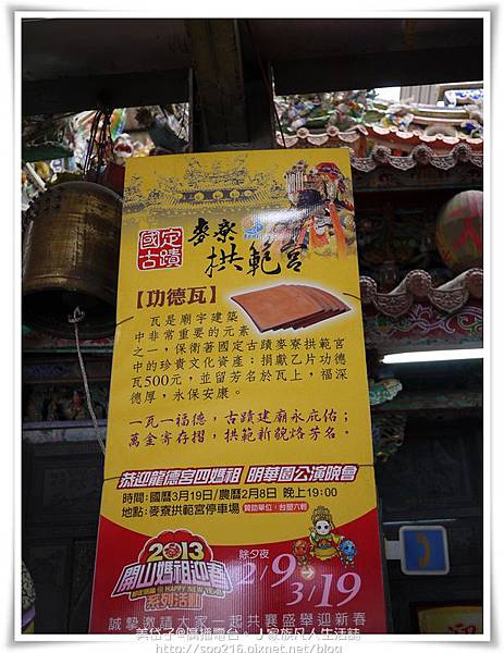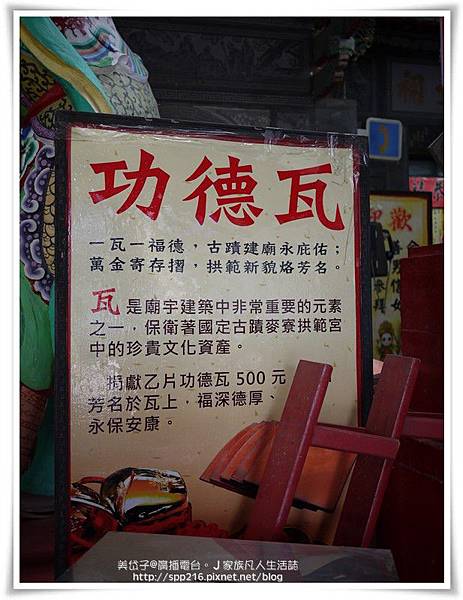 我們這一團,好幾個家庭阿~掏出銀兩,獲贈功德瓦乙片,日後這些瓦片都會在拱範宮的筵樑上,若真要找出屬名的那一片,似乎太費力氣。當日我們捐了不少功德瓦片,我也為我的爸爸媽媽添了功德瓦。