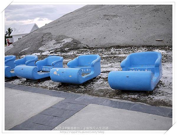 鹽山腳下有一列藍色雪橇塑膠座,,這該不會是用來從鹽山上往下滑的吧?