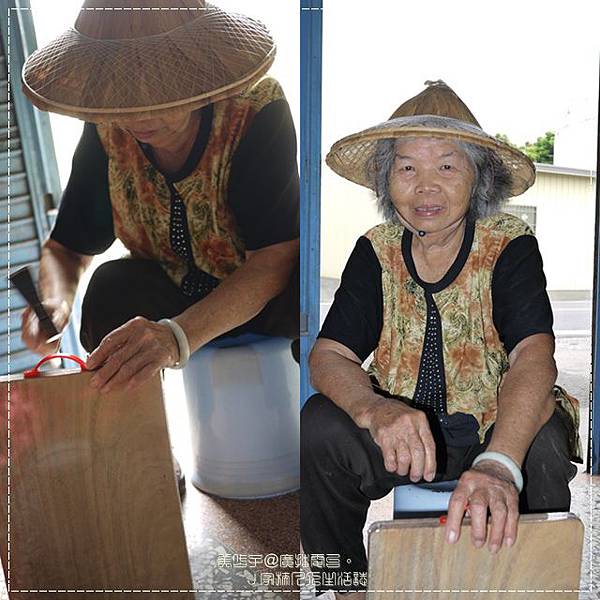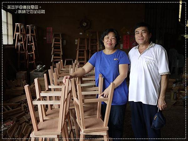 他笑著說:這裡就只有二位師父,一個是我,另一位就是我太太。現在生意不好做,需求量不多,你現在看到的這些大多是要外銷的,國內的單很少。原來,這位男士就是老板,我問他是否可以讓我拍個照,他很樂意同時說服他的太太一同入鏡。我家現在仍有傳統的高腳圓板凳,那椅子的歷史算起來都快百歲的,依舊堅固牢靠,傳統的木工不僅品質好、手工細,產品也很耐用。我對老板道謝,這個週日他們是休息的,卻還是樂心的分享;我問老板是否有做菜砧,他搖頭說他只作板凳,於是我問哪裡可以買到菜砧,他指引了方向,就在我們來的路上,同時也建議我們去文化館看看。