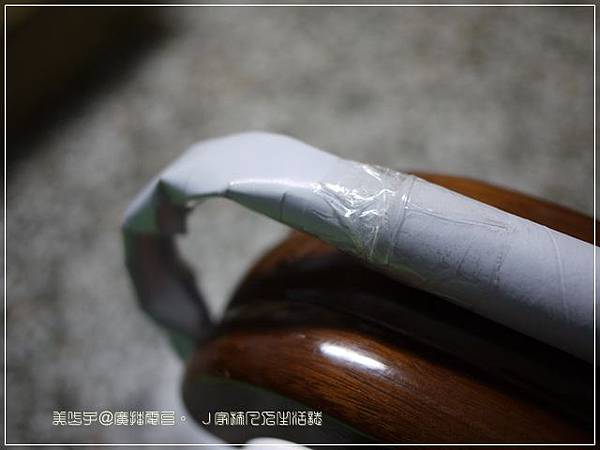 密封好頭尾後即可開始上底色包裝,接著就是繞斜線條圈。雖然拐杖頭已經用舊報紙補強,但是底色包裝仍遇上小問題,看來我得好好培養包裝技巧才是