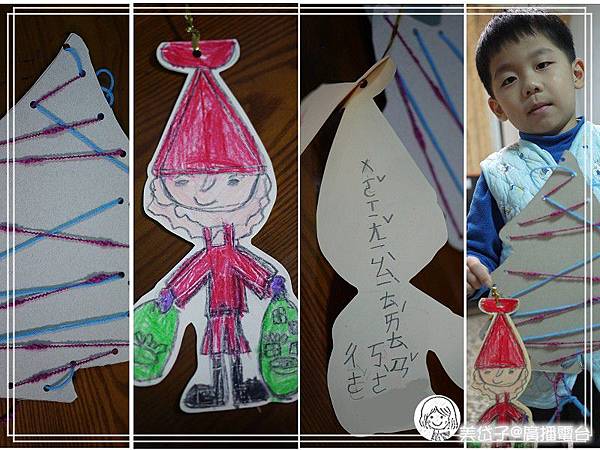 再畫張聖誕老公公的模樣,寫上願望,繫在聖誕樹上,超應景的;也可以在紙板上著色或貼上許多貼紙,百貨公司的dm紙長也能拿來剪貼用,總之,怎麼佈置聖誕樹都可以,只要高興、快樂的完成就行了。