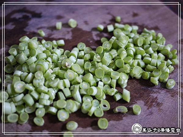 將蛋捲蕃茄豆飯切一小段一段,鏘鏘鏘!這就是Jolin的副食品-『蛋捲蕃茄豆飯』!