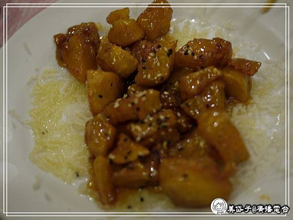 拔絲地瓜,這是我第二回吃拔絲地瓜,這道該熱熱的上桌,趁熱將拔絲地瓜放入冷水碗冷卻再食用,可惜上桌時已經過了「趁熱」的階段,雖然還是熱著的,卻非熱騰騰,拿取不易