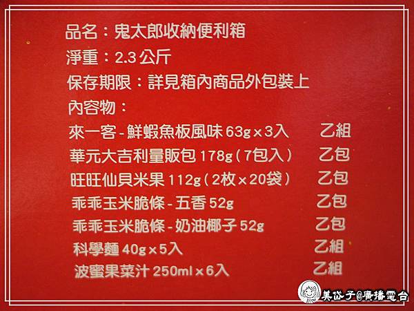 鬼太郎收納箱,內含波蜜果菜汁6入、科學麵5入、來一客3入、旺旺仙貝米果1包、乖乖奶油1包、五香乖乖1包、華元大吉利量販包1包,加上收納箱199元、50元折價卷2張,總價值高達640元(官方資料)
