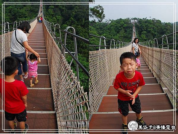 倒是阿乖,真是害怕著不敢走,甚至是哭了出來,後來是老爺牽著他走過來。我們沒跟著建議路線走,而是又從那頭走回這頭,根據我家老爺的說法,這叫「走夠本」,想當然阿乖又是哭喪著臉,不過回程有比去程好多了(事過幾日,阿乖對我說:媽媽,下次不要再帶我去走吊橋了,我不想再走吊橋了!果真是有被嚇到)。