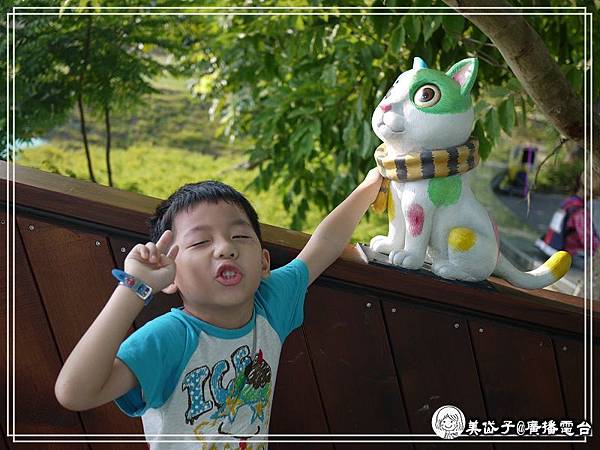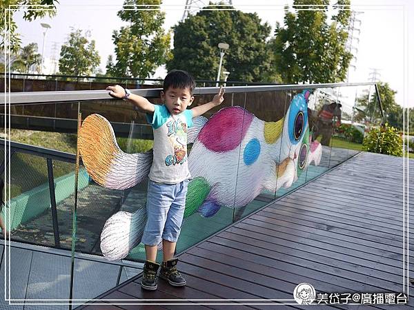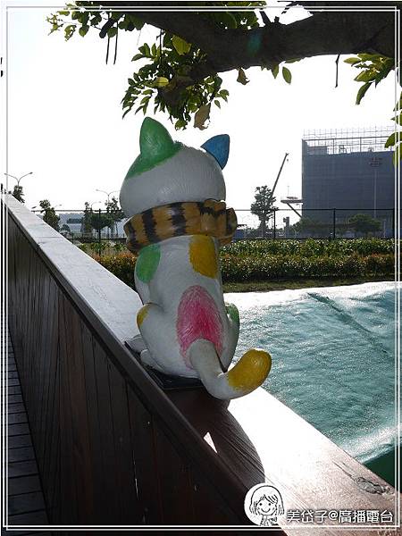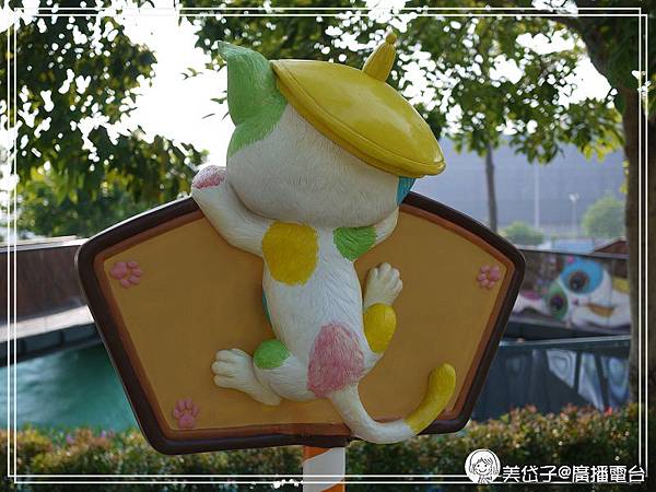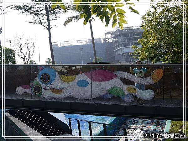 第二道夢想木棧道的玻璃牆面有一隻超大的神燈貓正悠閒趴著,面帶微笑俯視渠道