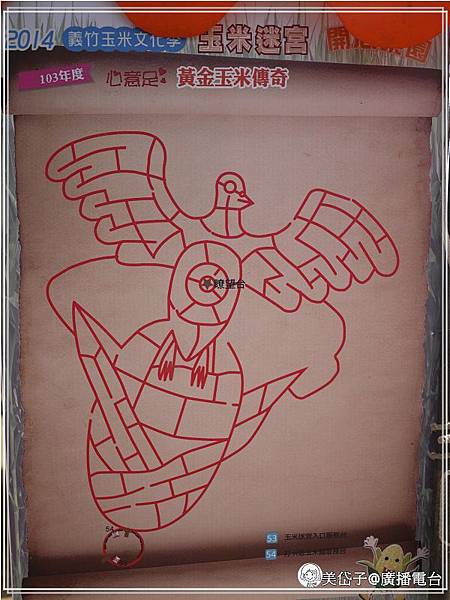 服務處也掛了一張這次迷宮設計的圖樣,看起來就是一隻展翅的老鷹抓著玉米飛楊:鷹場義竹、玉米起飛!這也讓我突然想起孩子們很愛的巧虎系列主角之ㄧ~桃樂比