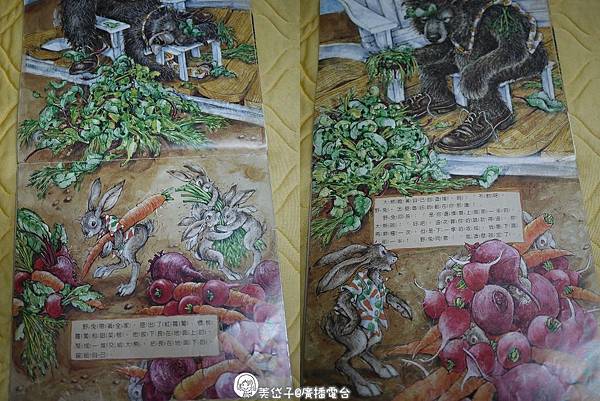 原來這一回野兔家種植的是蘿蔔,收成後,野兔一家將蘿蔔留了下來,蘿蔔上頭的葉梗就是約定好要給大熊的報酬
