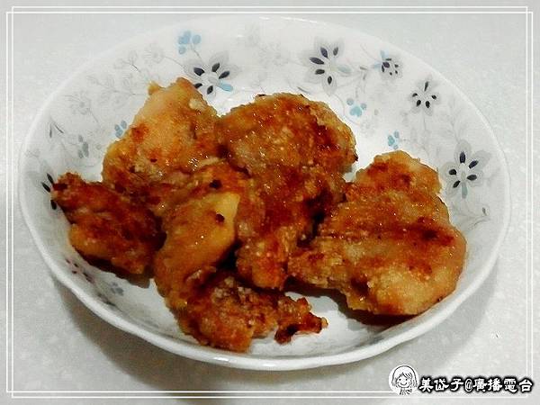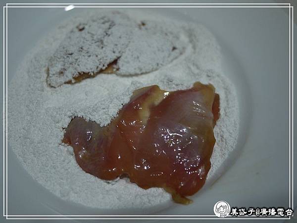 倒了一些木薯粉(地瓜粉,也能用酥炸粉取代)在盤上,在將蒜醬醃製過的雞肉片一片一片放在木薯粉上翻轉,若愛吃粉皮者,可以試著以手掌壓肉片沾粉會裹上較多且均勻的木薯粉,我看坊間香雞排業者都是這樣做的,但是粉皮對我來說非必要,所以...翻轉一下就好