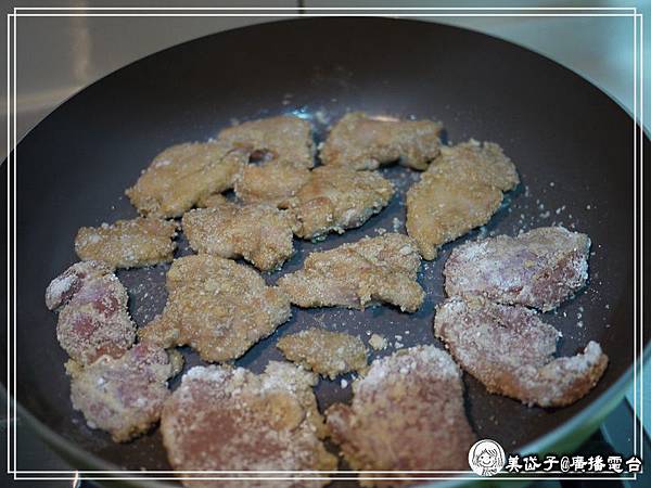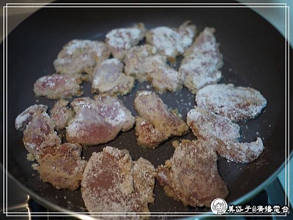 視雞肉片邊緣的木薯粉變化狀況,呈微微透明狀時即可翻面煎(經驗值),這樣間起來的雞排賣像比較好,黃澄亮著哩