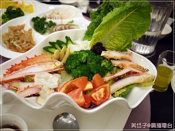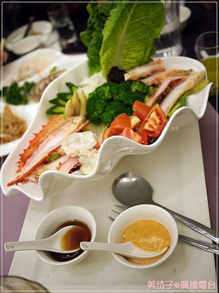 日式蔬果帝王蟹~簡單的說,這是一道「莎菈菜」,兩種醬料搭配,可各取所需;原本是要飯店將帝王蟹改龍蝦,可是被否決了~成本考量