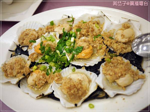 金蒜墨麵蒸鮮貝~蒸扇貝味道還不錯,加了上頭的蒜末,吃了一個就滿口的蒜味,扇貝下的黑色墨魚麵應是純水煮熟後直接舖成,調味則是蒜末與扇貝的湯汁,相較於扇貝的蒜末重口味來說,墨魚麵則顯得較為平淡