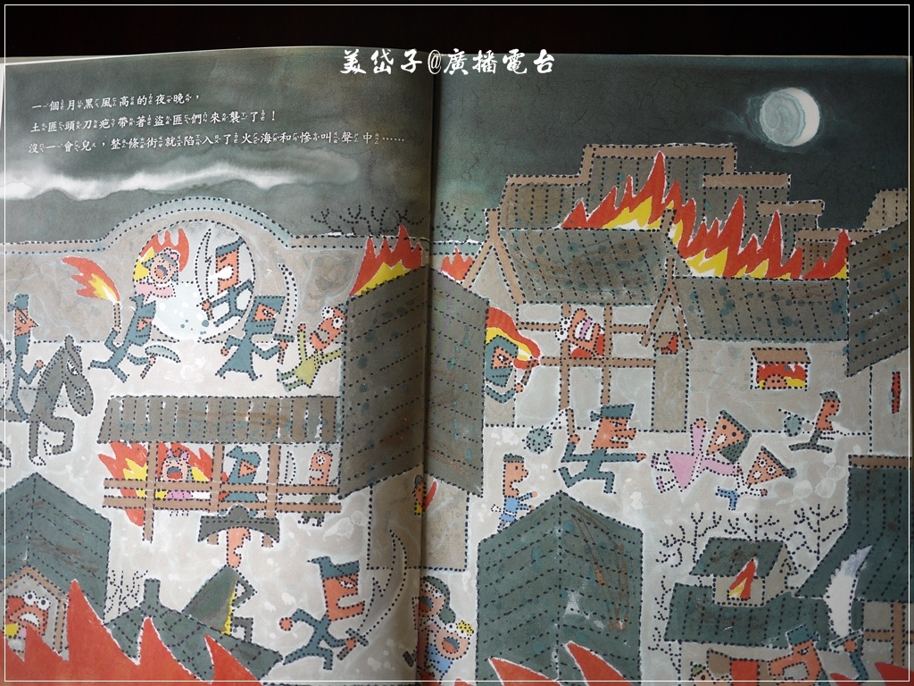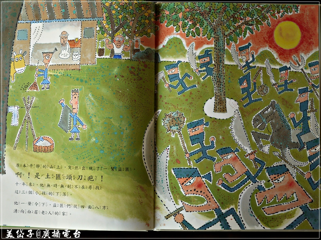 哇~看到這一跨幅的圖畫,明眼人一瞧就知道這是武俠劇常會出現的畫面,不是仇殺就是為了金錢、利益,但說到土匪頭刀疤(左邊,騎著馬),那原因就屬於後者了。原本應該是血腥的畫面,但作者平面簡易的畫風中散去血腥,只剩熱鬧
