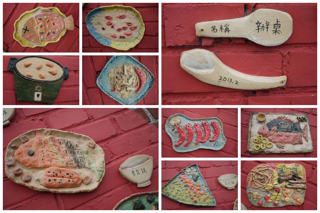 離開成龍集會所後,我們繼續往前,要來去找「辦桌」,千萬別以為我們是要去吃黑松大飯店哩,而是要找尋一面紅牆,和上圖一樣是有著陶土創作的牆