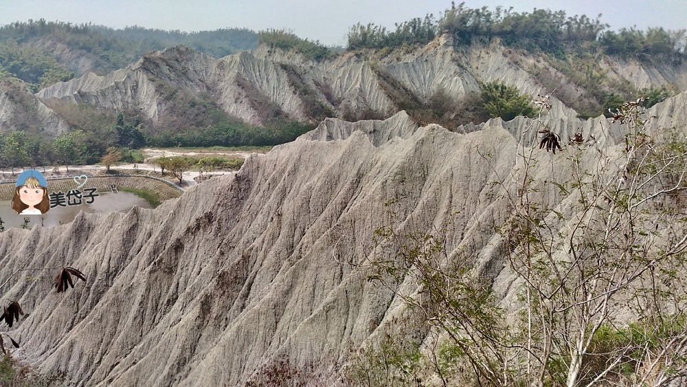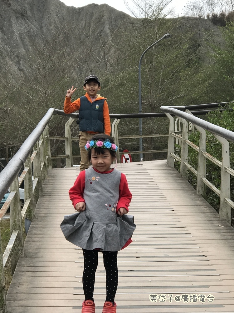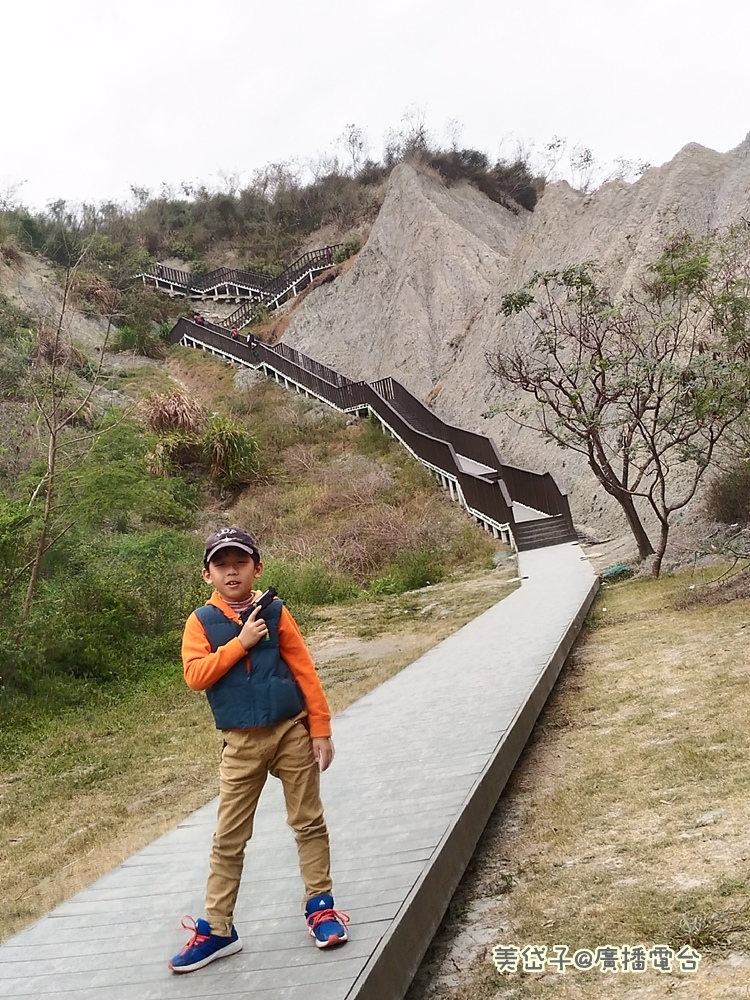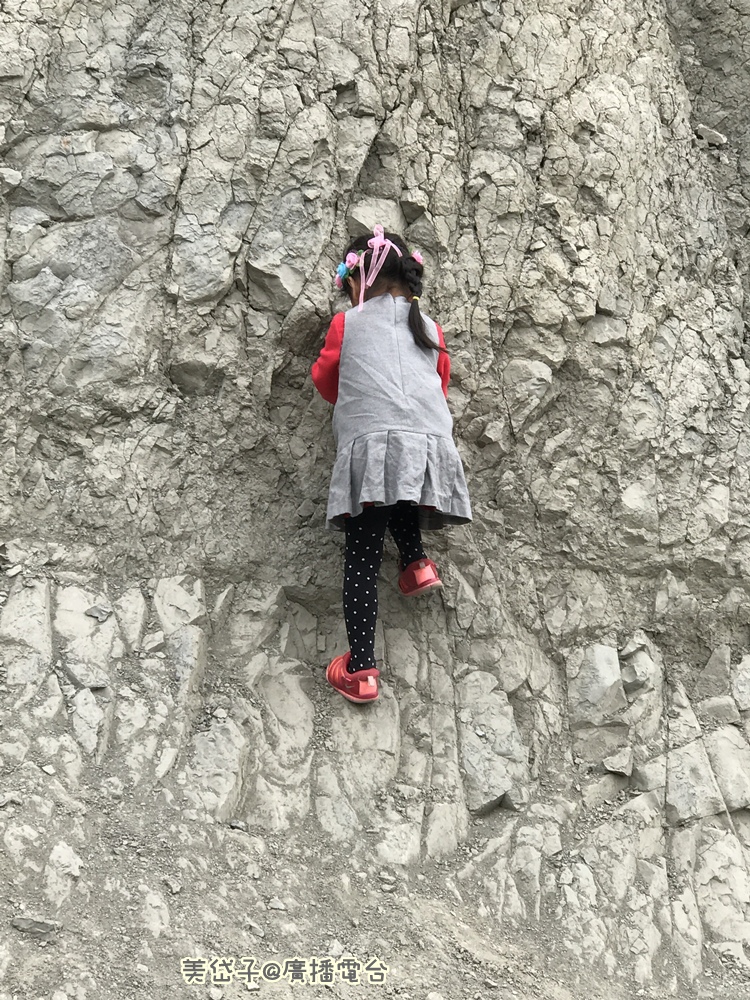中間還要經過惡地步道,在這邊孩子可以近距離的觀看、觸摸泥岩,這小妞竟是一轉眼就跑去「爬山」
