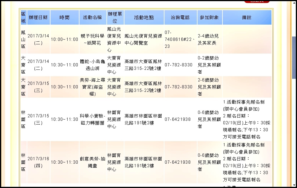 除了有承辦單位、服務對象&項目外,開放時間、聯繫網站、電話、地址一應俱全,這些育兒資源中心都會不定期的舉辦活動,可以參考該資源中心的聯繫網站或公佈欄