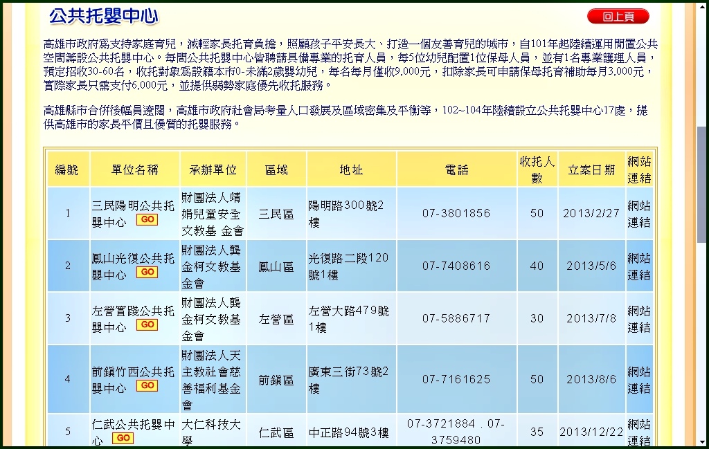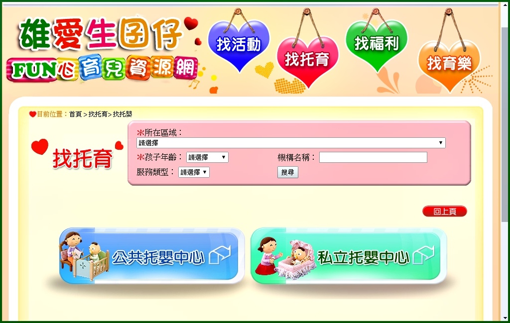 以[找托育中心]為例,又區分為公私立托嬰中心,資料陳列出來的都是有政府立案或登記的,非地下資源