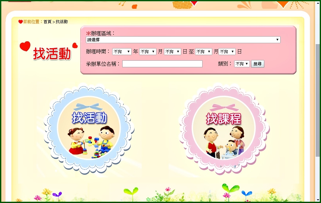 一、「找活動」:內容包含親子活動與課程,選擇辦理區域(必挑),其他的再依自己需求挑選,除了必要挑選的欄位外,其他欄位留下空白也是可行的