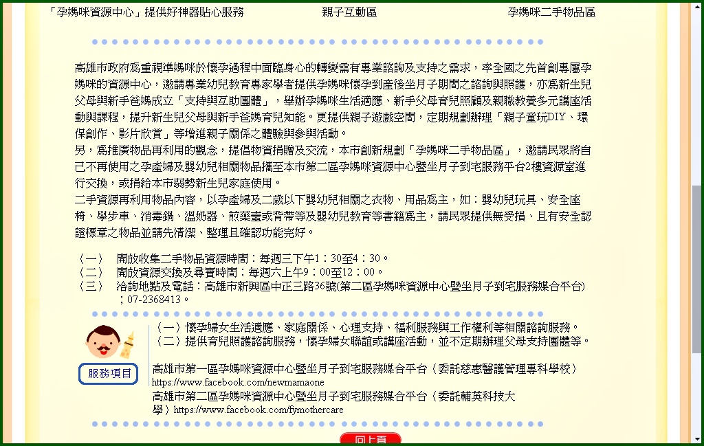 高雄市第二區孕媽咪資源中心暨坐月子到宅服務媒合平台(委託輔英科技大學經營管理) |