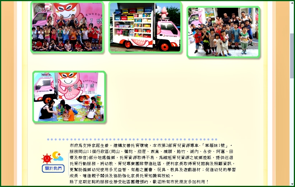 在[育兒資源中心]中有《育兒資源車》和《育兒資源中心》 《育兒資源車》有青蜂俠一號和草莓妹一號,分別服務大旗山9區和岡山11行政區,是服務較偏遠鄉村地區的民眾,為縮短城鄉差距