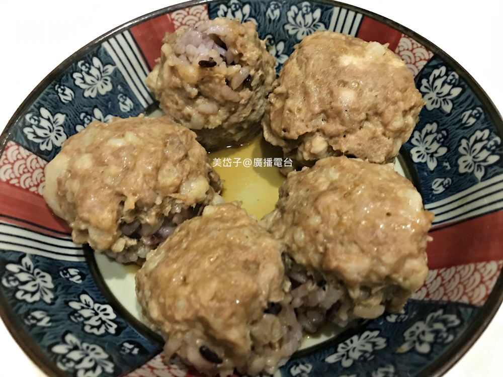 絞肉飯糰子,管飽,蛋白質也夠量,米飯中有添加青花素豐富的黑米,再汆燙一些綠色蔬菜就是營養滿滿的一餐嘍!