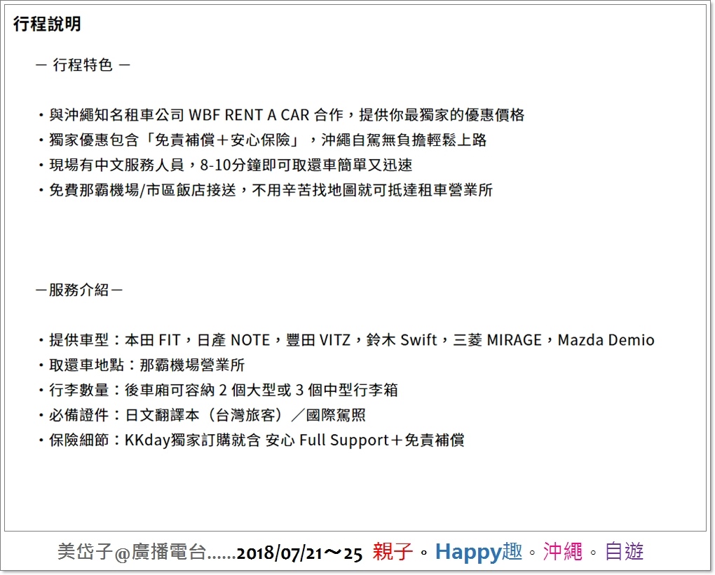 在日本租車一般都有包含「免責補償」,身為日本國的外國人,在不熟悉路況的前提下,Full Support是減少損失的必要保險,保險費用不算便宜,KKday租車費用中也全含了。另一考量「現場有中文人員服務」對於不熟悉日語的我們是很必較的,可以減少許多語言上的差異認知;此外,針對人員接送的問題我也曾和對方聯繫(租車商WBF,一樣中文回覆),我的問題是只接送駕駛二人,還是可接送全員?畢竟我們是在第二天才租用車子,若是不能全員接送,光是耗在往返的時間會差異約1小時,當時WBF的回覆是要依當日接送的旅客數&派車情況而定,若公司派大車接送,有大空間可以就可全員接送。
