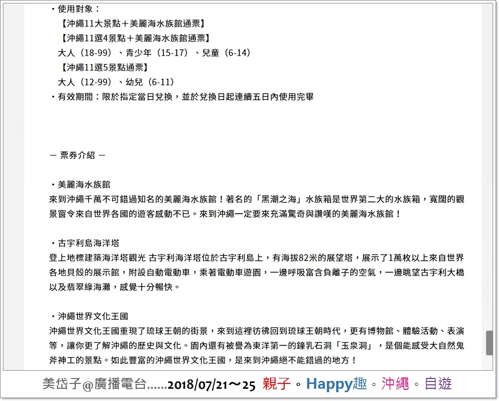 最後會選擇KKday的原因除了票價便宜些外,請看票務內容的使用對象,購買【沖繩11景點+美麗海築館通票】,6-14歲都算是兒童。