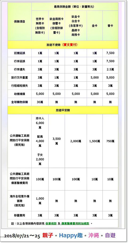 也有朋友不論信用卡提供的旅平險,出發前再投保一次完整的旅平險內容,正常來說五天的旅平險費用正常來說至多就一千多元(高保額不計),出國幾萬元都花了,旅平險算是小CASE了,沒用到最好,若是意外碰上飛機停飛或突發狀況,旅平險可以發揮的作用是很高的。