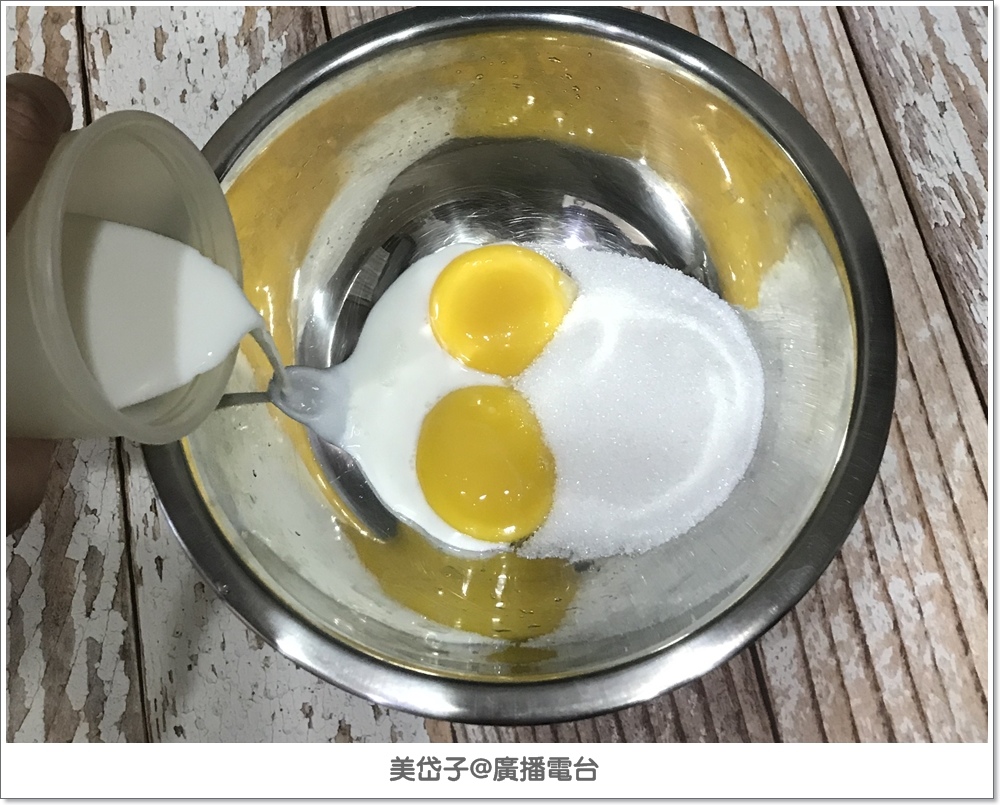 先將細砂糖、蛋黃、牛奶打勻。