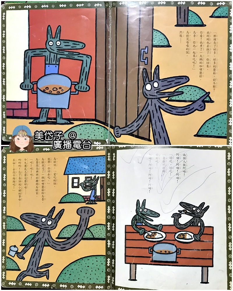 於是兩隻大野狼快樂的享用美食,烏魯還打包帶走了一鍋咖哩蘑菇, 什麼都很好,只除了忘記告訴烏歐睡午覺森林中有好多小豬