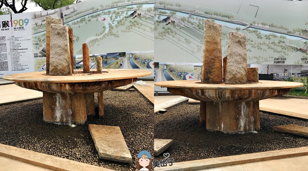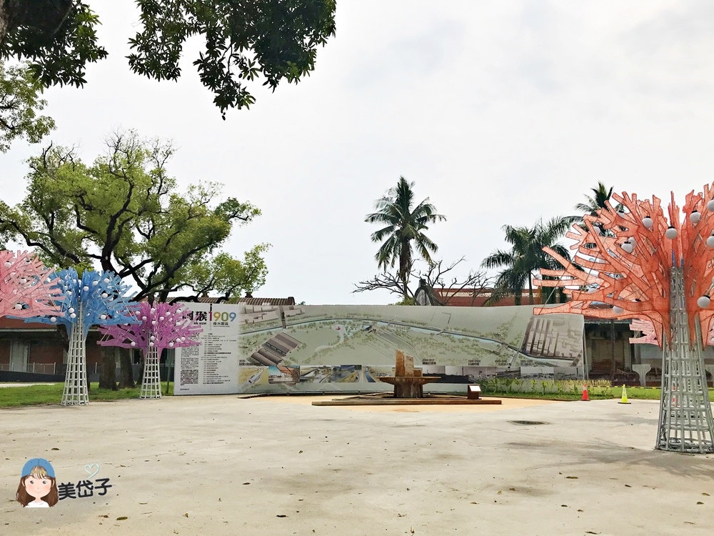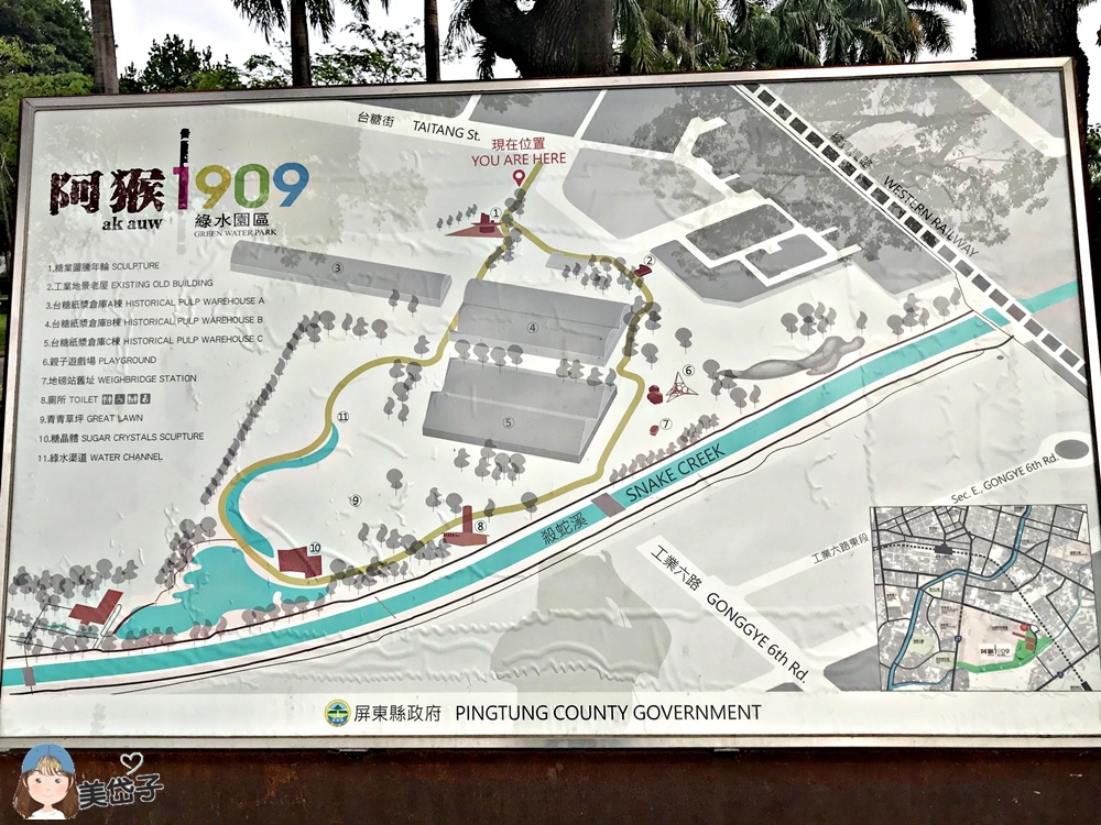 這裡有阿猴1909綠水園區全區的分布圖,看一下心中有底。園區目前有修復舊的紙漿廠古蹟、趣味親子遊戲場、糖業圖騰年輪水景以及青青草坪等休憩空間,依規畫藍圖逐步開放殺蛇溪的左岸,打造親水空間、生態濕地、五分車、自行車道等設置,提供民眾更多舒適、有趣的休憩空間。