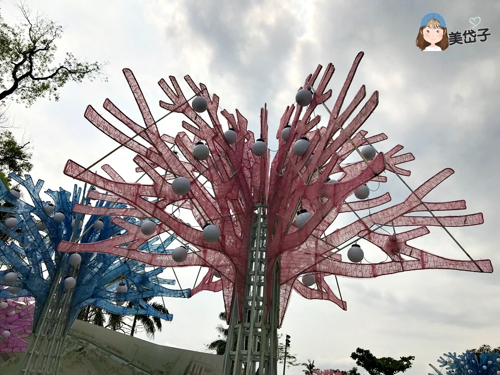 這一區的彩葉珊瑚樹燈組挺特別的,不清楚幾點才會亮燈,當燈泡亮起,透過不同色系的紗網布會有美麗的燈光效果吧!
