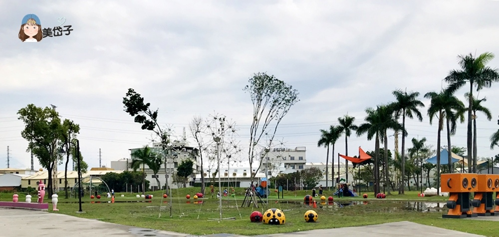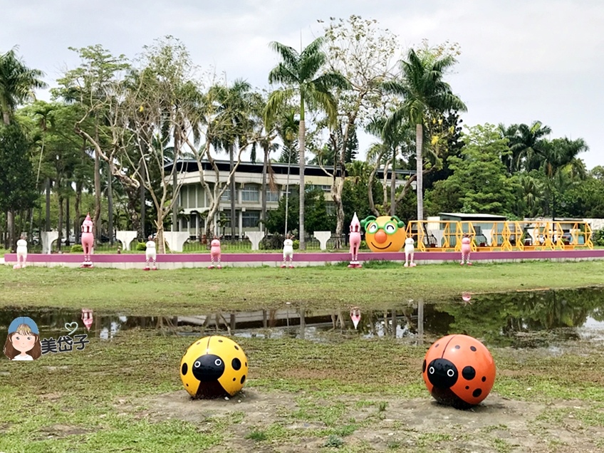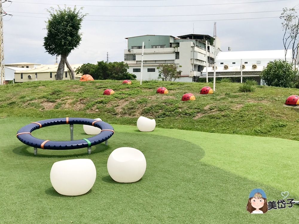 瓢蟲能有什麼含意?原來,早年糖廠種植甘蔗,是利用瓢蟲抵禦蟲害,為彰顯台糖之於屏東的意義,建置特色遊戲場時,就以此概念結合山丘上的甘蔗地景(一根一根佇立的白色物體),鋪設不少的小瓢蟲點綴,往橋的方向走偶爾能看到火車通過,讓遊戲場有活潑生動感也涵蓋歷史文化意義;此外,瓢蟲也有「追求夢想的勇氣與無窮希望」意象,藉以傳遞特色遊戲場「勇於接受挑戰」的概念。