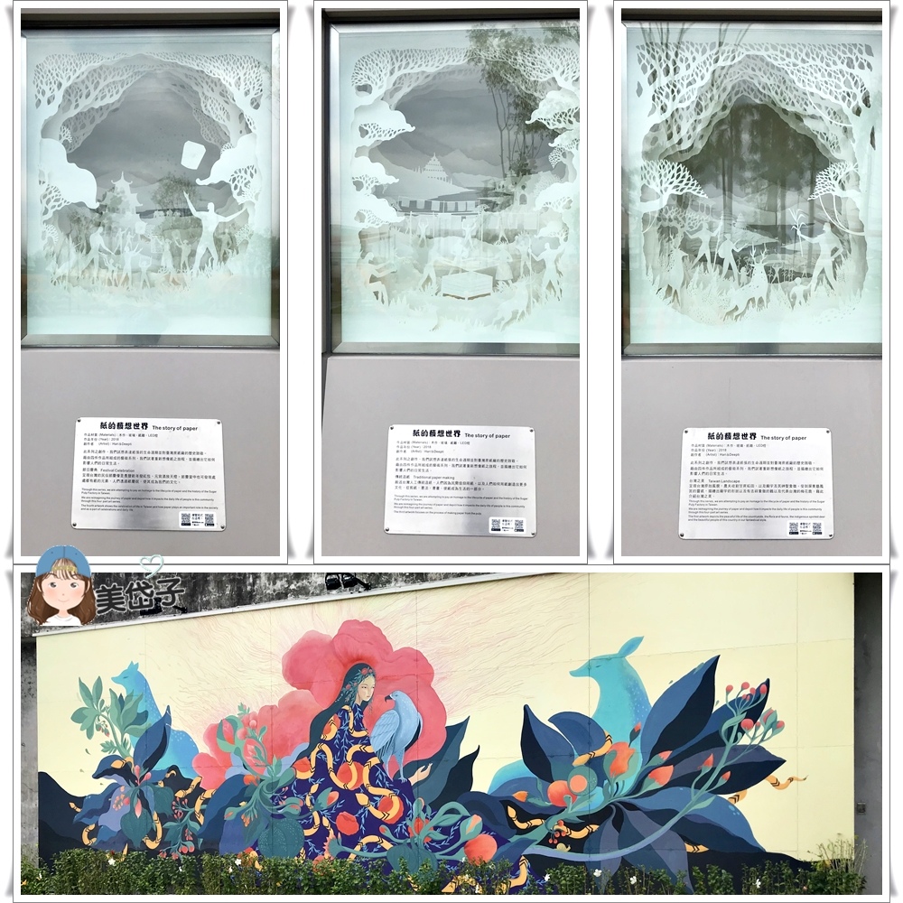 在倉庫的外有四幅「紙的藝想世界」創作系列(上圖放了其中3幅),主要表達「紙張的生命週期並對台灣蔗紙廠的歷史致敬」,每一幅創作主題都不同,描繪著紙張是影響著人們的生活作息,很值得欣賞。另外還有一幅「蛇、紅花、狐、鳩與仕女」的彩繪圖~拍謝,忘記這幅畫的主題。