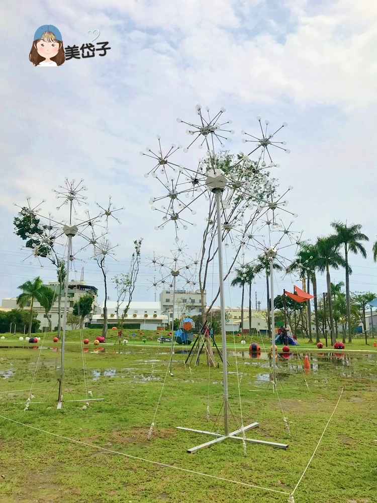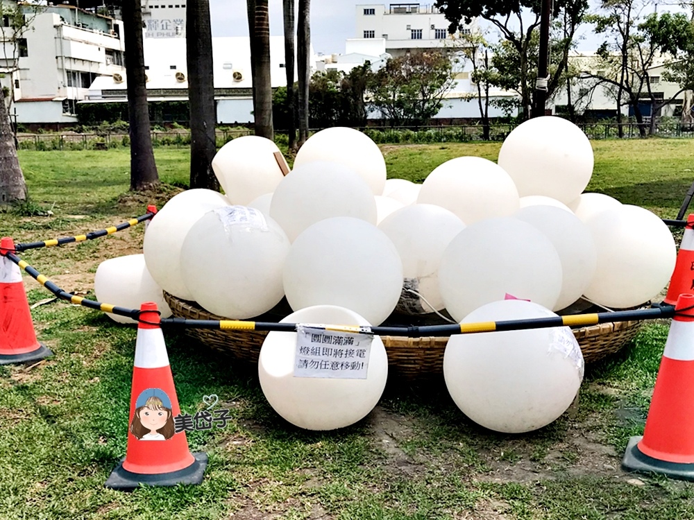 看到一團堆疊的白色造型座椅,外為貼了一張「圓圓滿滿」燈組(亦為2019屏東燈會展出的燈組)即將接電的告示,一度狐疑散落在遊戲場上的白色座椅都是燈組