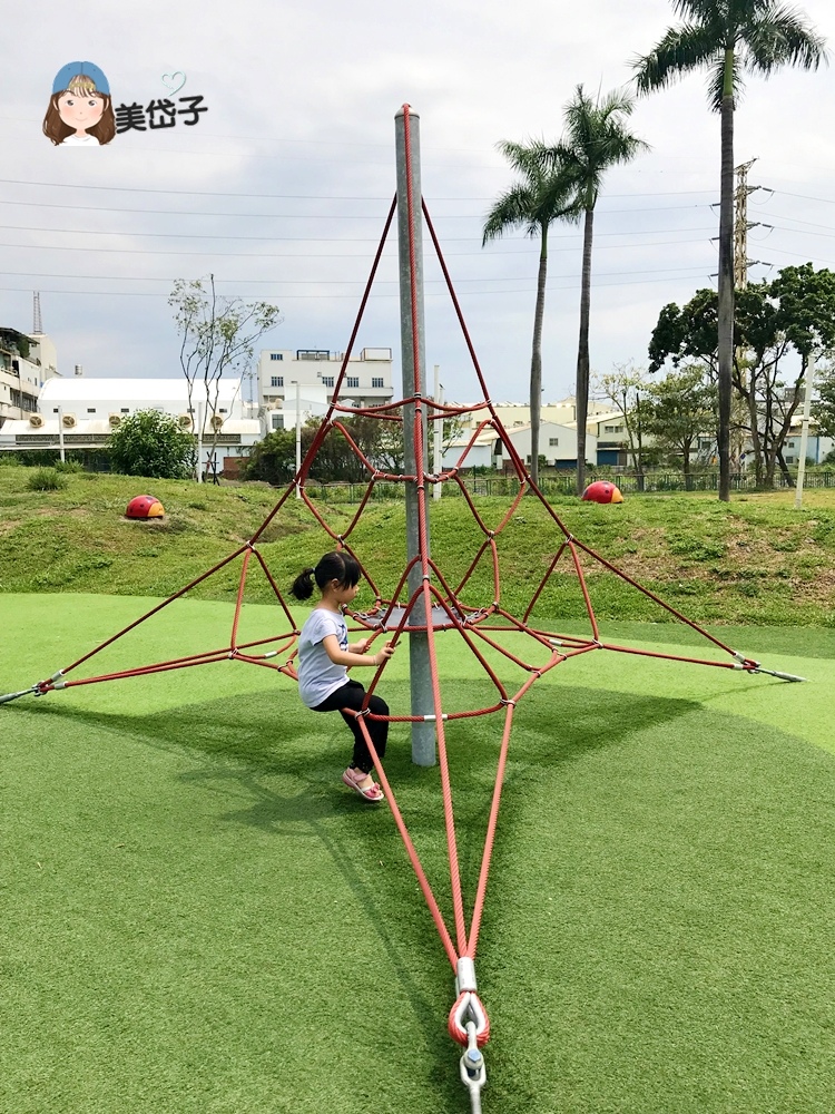 親子特色遊戲場並未有明確的區分幼童區、大童區,不過就整體的布置看來,還是有所依序的。如這一小座的三角錐立體攀爬網,銜接在幼童區旁,適合給學齡前的幼童&國小生挑戰。