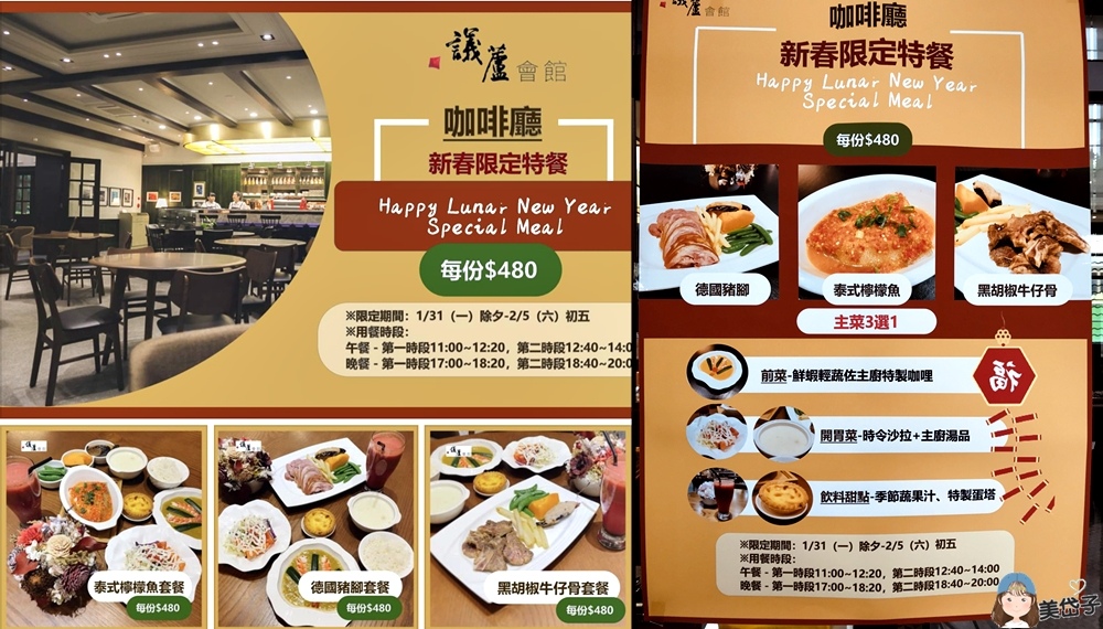 我們預約得比較晚,僅剩當日中午的咖啡廳有座位,只是年節期間都提供套餐,每份480元。問過大家的意見都說可以,所以就......吃套