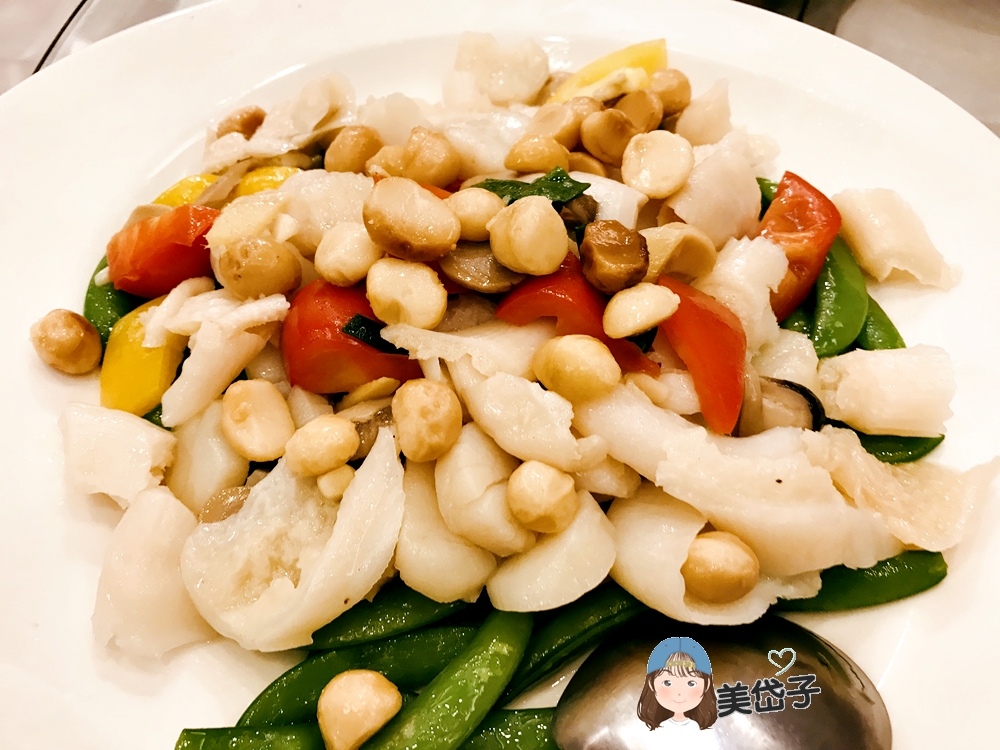 菜單上是寫「腰果炒帶子」,但實際上桌卻是「彩椒燴三鮮佐夏威夷豆」,不知道要說是賺到還是虧了