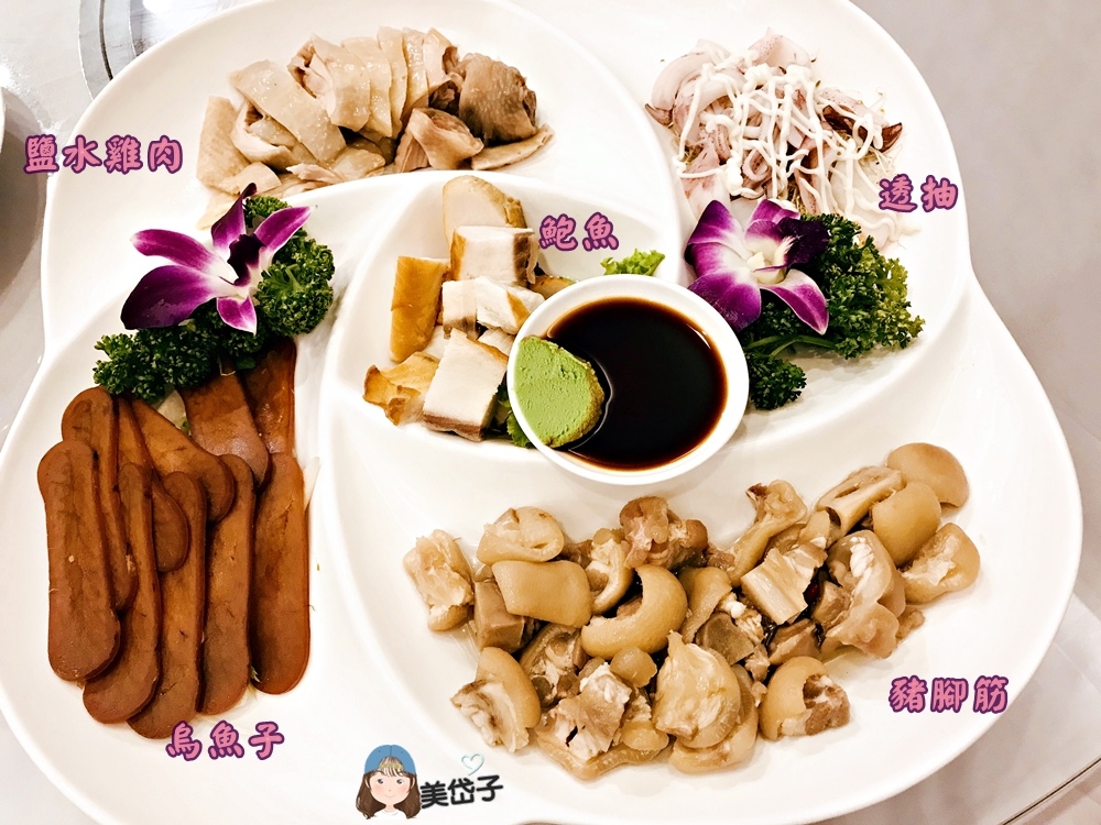 第一道「五福喜臨門」是宴會餐上會出現的拼盤。這道最讓我喜愛的是烏魚子,不僅不乾澀,還濕潤得恰到好處,好吃不咬舌