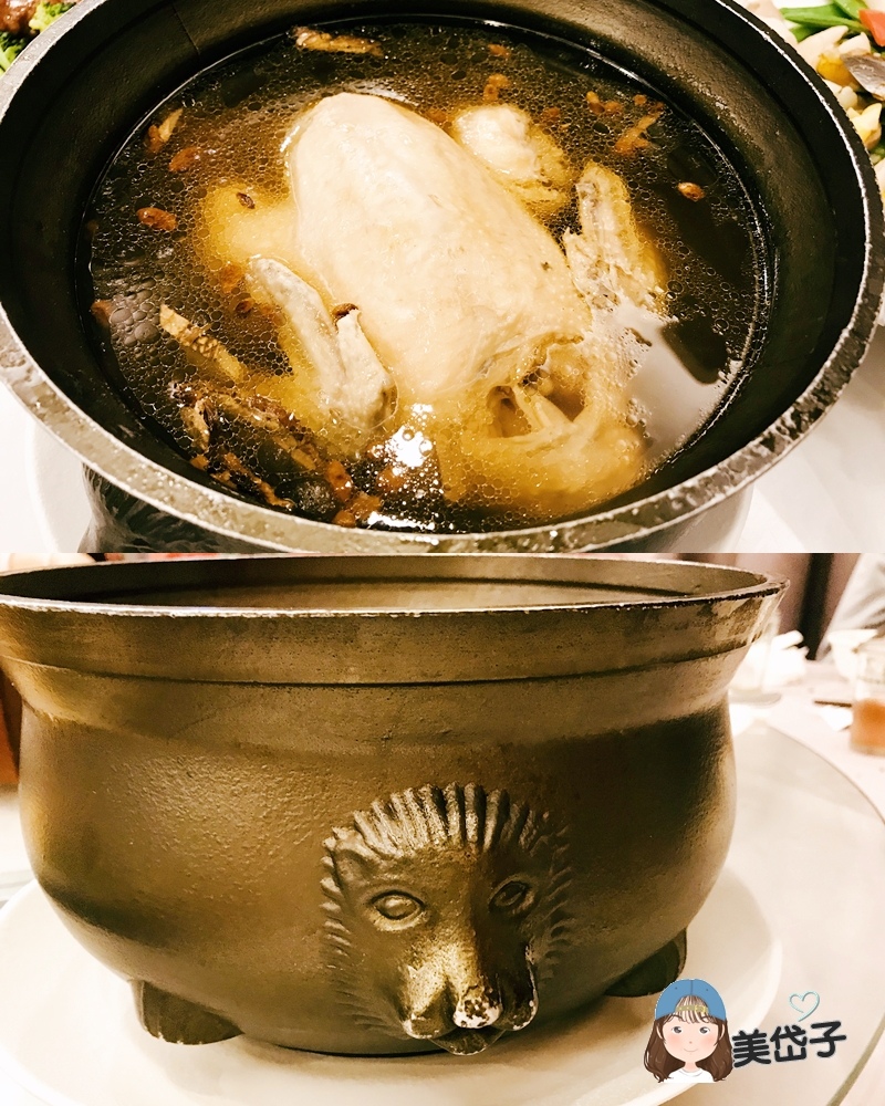 這鍋牛肝菌燉雞一上桌,眼睛就被器皿給吸引,看似個鼎鍋,前後還有著似豹又似獅的浮雕像,湯頭甘甜順口,雞肉也燉得爛熟。