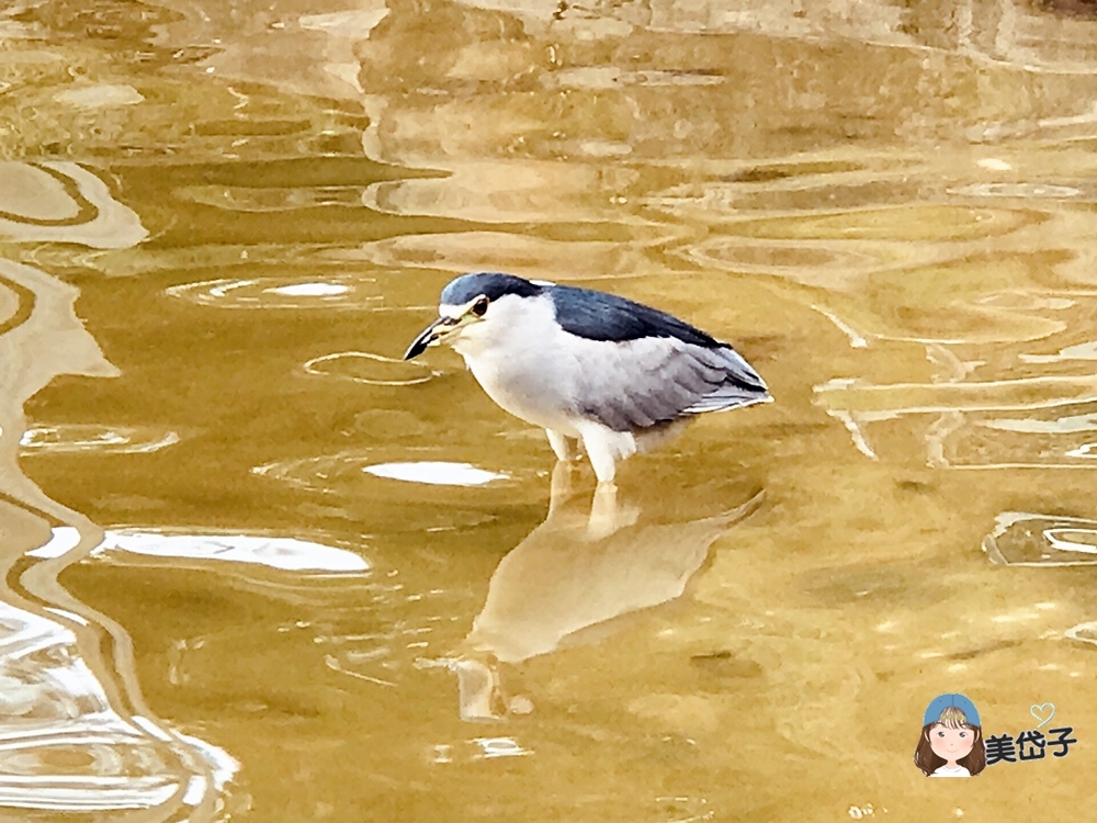 有隻夜鷺在園區中盤繞,或水中、或樹上。