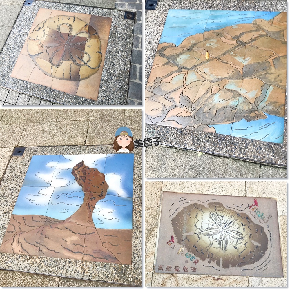 若是有仔細注意可以發現園區的步道上有著野柳特色景觀地磚,包括最有名的女王頭、豆腐岩和海蝕化石。
