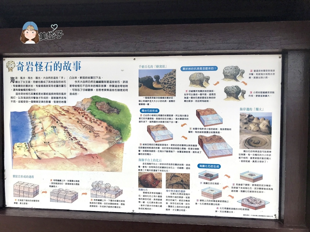 園區裡有一奇岩怪石故事看板,有簡單的介紹野柳的地景形成的原因,內容有蕈狀岩(蜂窩頭)、燭台石、海蝕化石;側旁的小徑即為第一區的蕈狀石、薑石、燭臺石集中區。