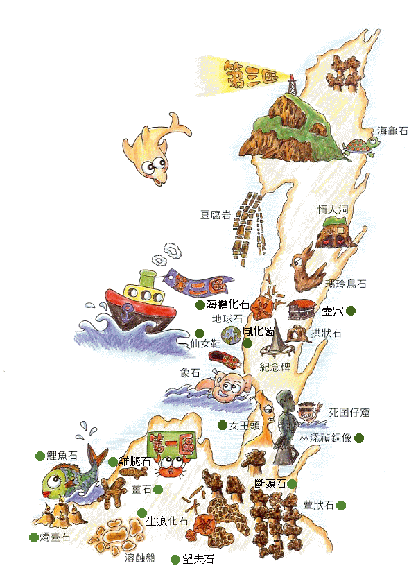 (上圖圖片來源自:黛西的網路城邦 https://album.udn.com/daizee/photo/3775984) 看官網的景區介紹將野柳地質公園分為三區,恰巧發現了這張手繪圖,將野柳著名的地質點、園區區分都繪得相當清楚。對照著自己的照片記錄,發現自己錯過第一區好多地質點,就連有名的燭臺石都沒看到![]()