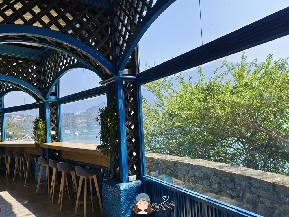 室內可算是潭邊絕佳的賞景處之一,在原長廊式涼亭的主架構上加以裝潢佈置,就成了遊客休憩、聊天、賞景的平台,也有成為網美店的條件;若是碰上日月潭施放煙火時,此處一定很受歡迎。